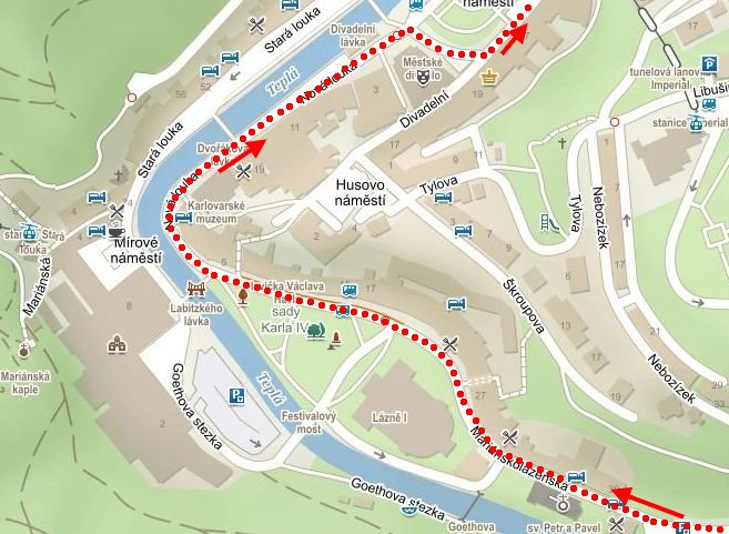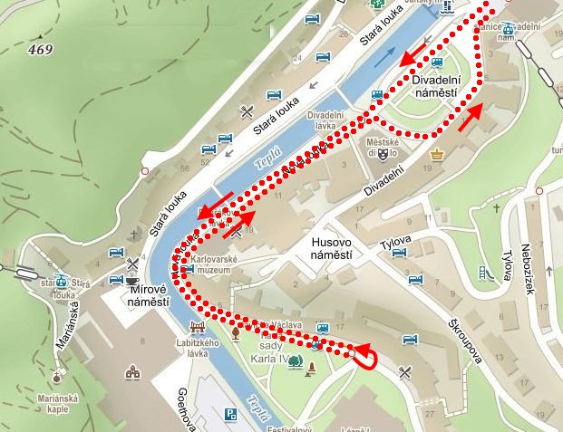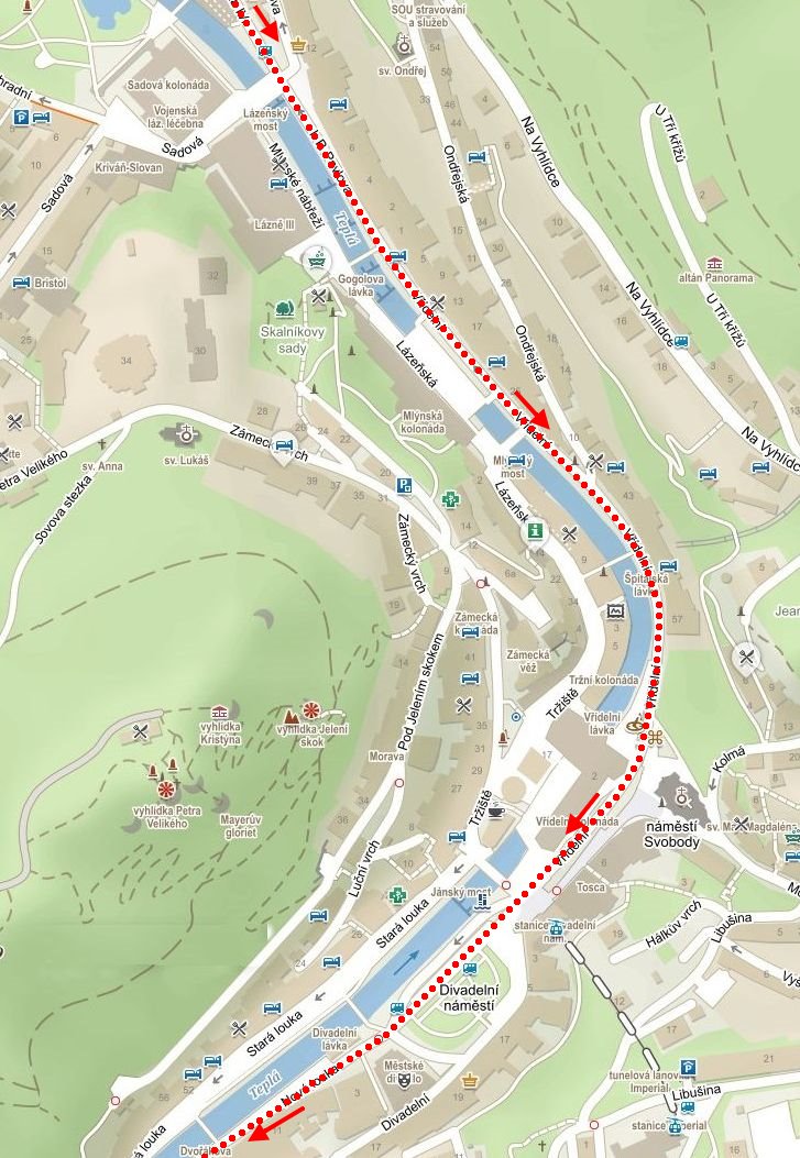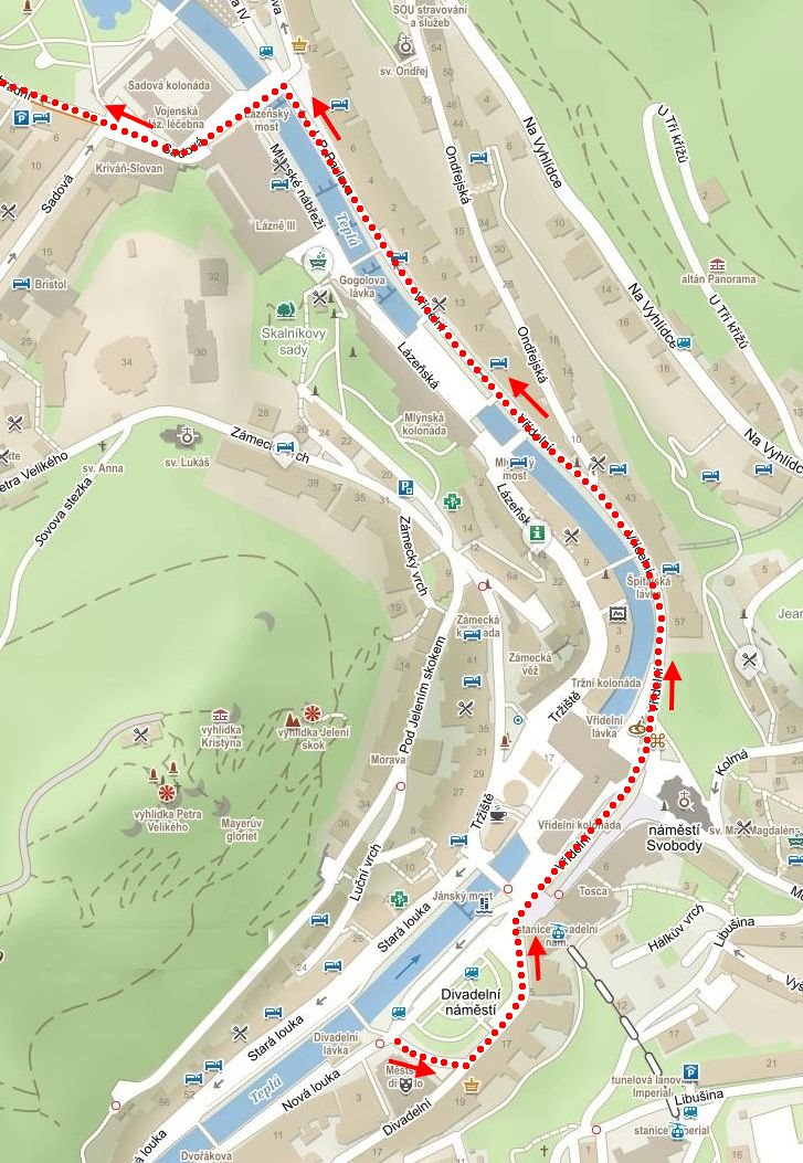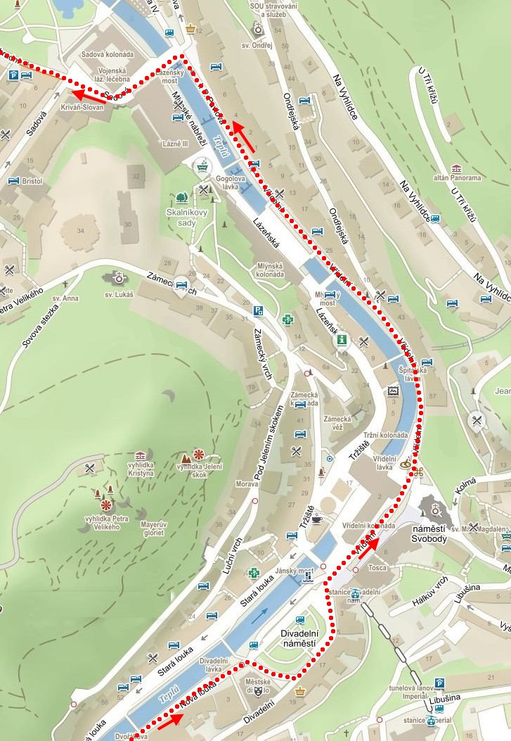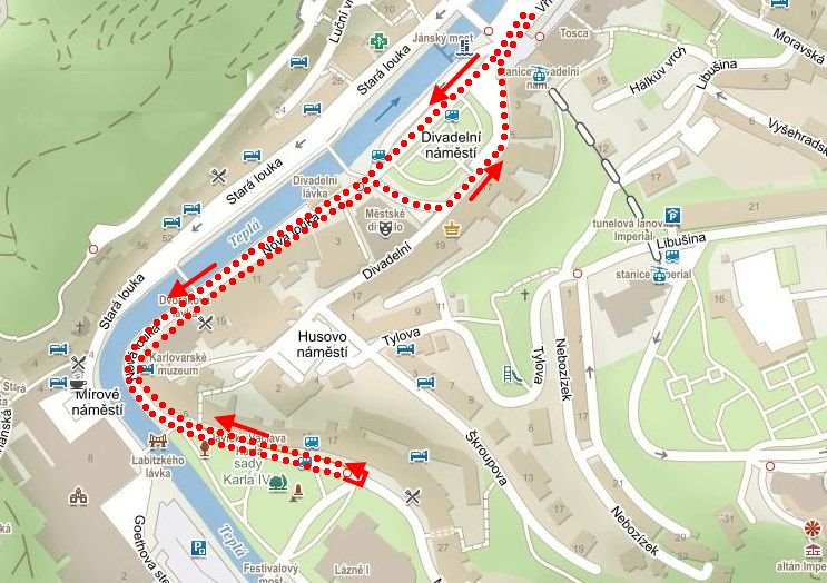 Trasa středně dlouhého okruhu - Pošta - Alžbětiny lázně (Lázně V.) - Hotel Thermal - Lázeňský dům (Lázně III.) - Mlýnská Kolonáda - Vřídlo - Divadelní náměstí - Karlovarské divadlo - Grandhotel Pupp - Císařské lázně (Lázně I.) - Carlsbad Plaza - a zpět - Divadelní náměstí - Vřídlo - Mlýnská Kolonáda - Lázeňský dům (Lázně III.) - Sanatorium Kriváň - Sadová kolonáda - Hadí pramen (15 pramen) - Pošta