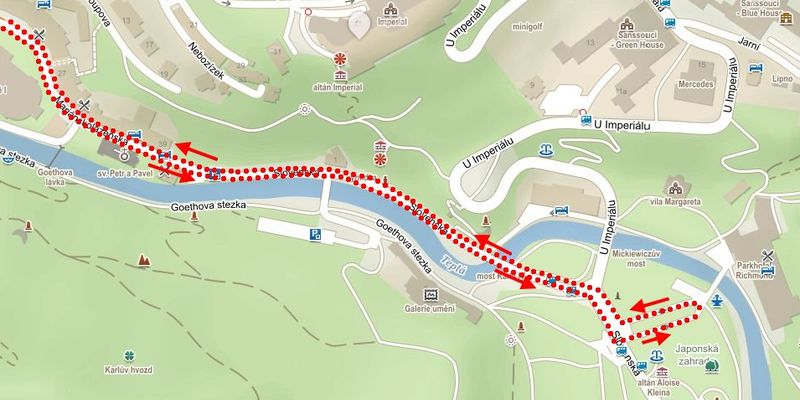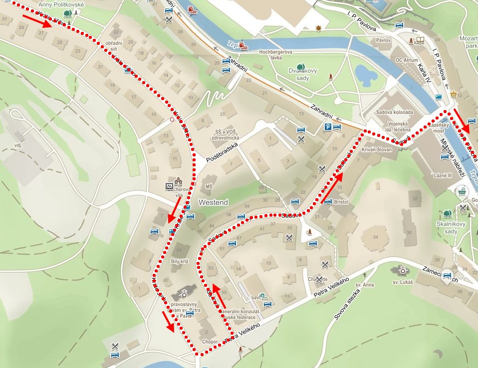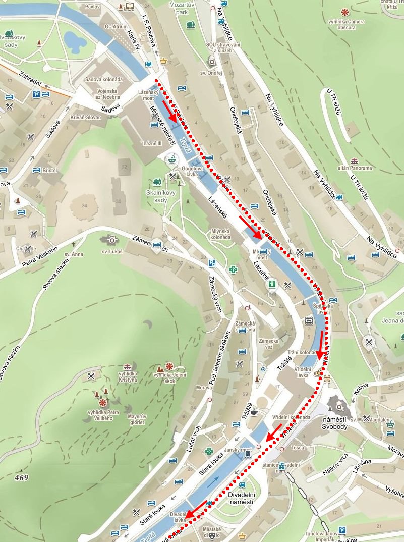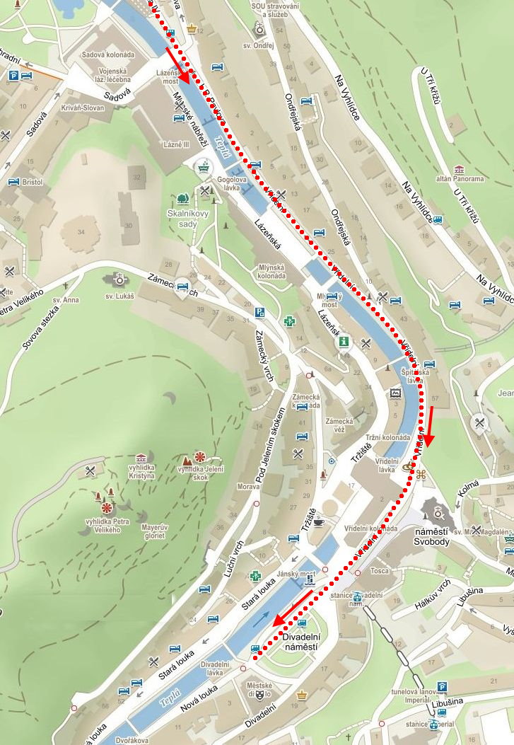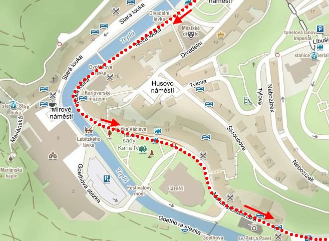 Trasa středně dlouhého okruhu - Pošta - Alžbětiny lázně (Lázně V.) - Hotel Thermal - Lázeňský dům (Lázně III.) - Mlýnská Kolonáda - Vřídlo - Divadelní náměstí - Karlovarské divadlo - Grandhotel Pupp - Císařské lázně (Lázně I.) - Carlsbad Plaza - a zpět - Divadelní náměstí - Vřídlo - Mlýnská Kolonáda - Lázeňský dům (Lázně III.) - Sanatorium Kriváň - Sadová kolonáda - Hadí pramen (15 pramen) - Pošta